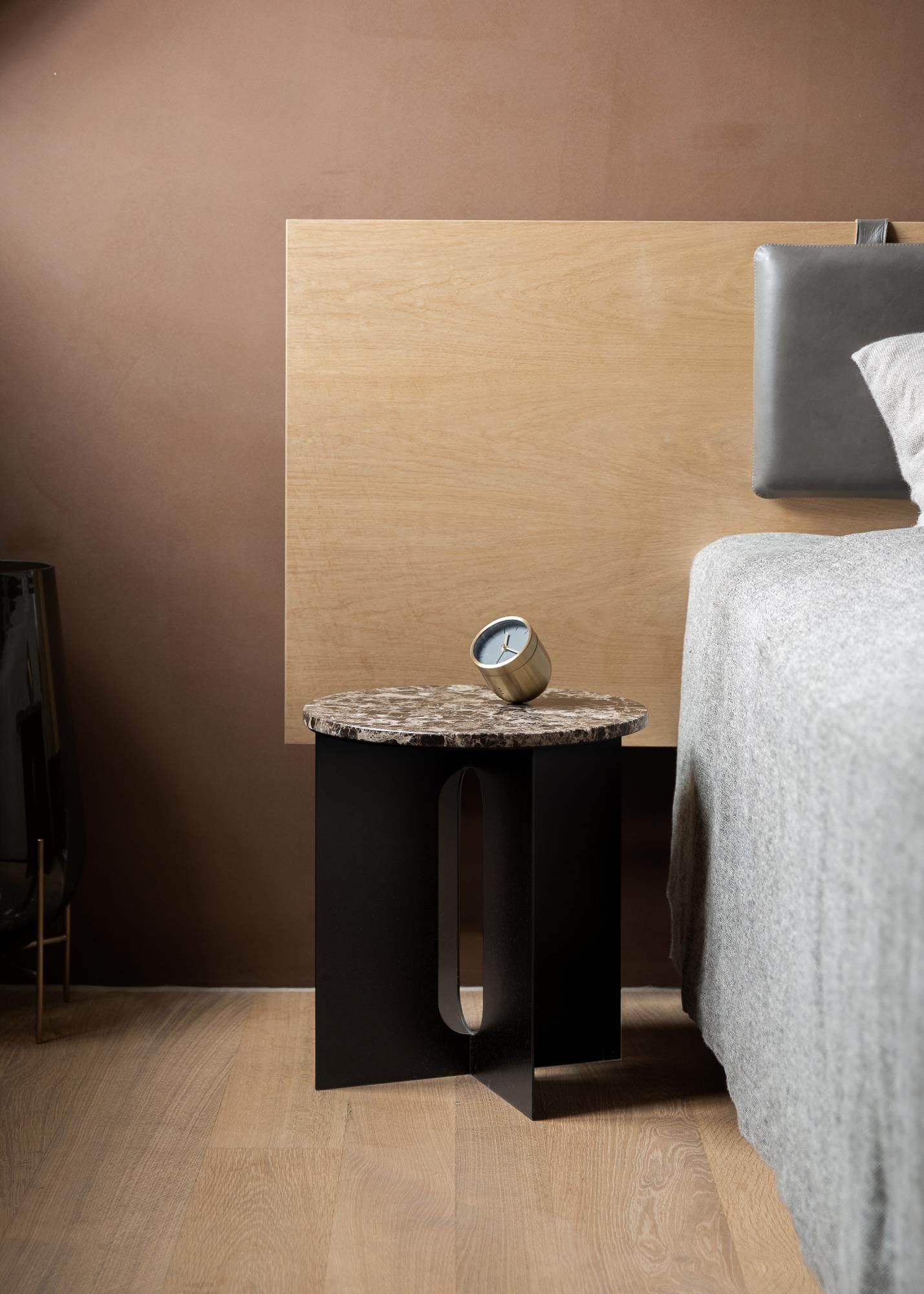 Marmorikansi tuo pöytään ylellisyyttä ja rauhallisuutta. Kiven luonnollinen pinta ja metallin selkeys täydentävät toisiaan, mikä tekee kokonaisuudesta yhtä aikaa harmonisen ja näyttävän. Pöydän kansi sopii yhteen halkaisijaltaan Ø40 Androgyne sohvapöydän kanssa,