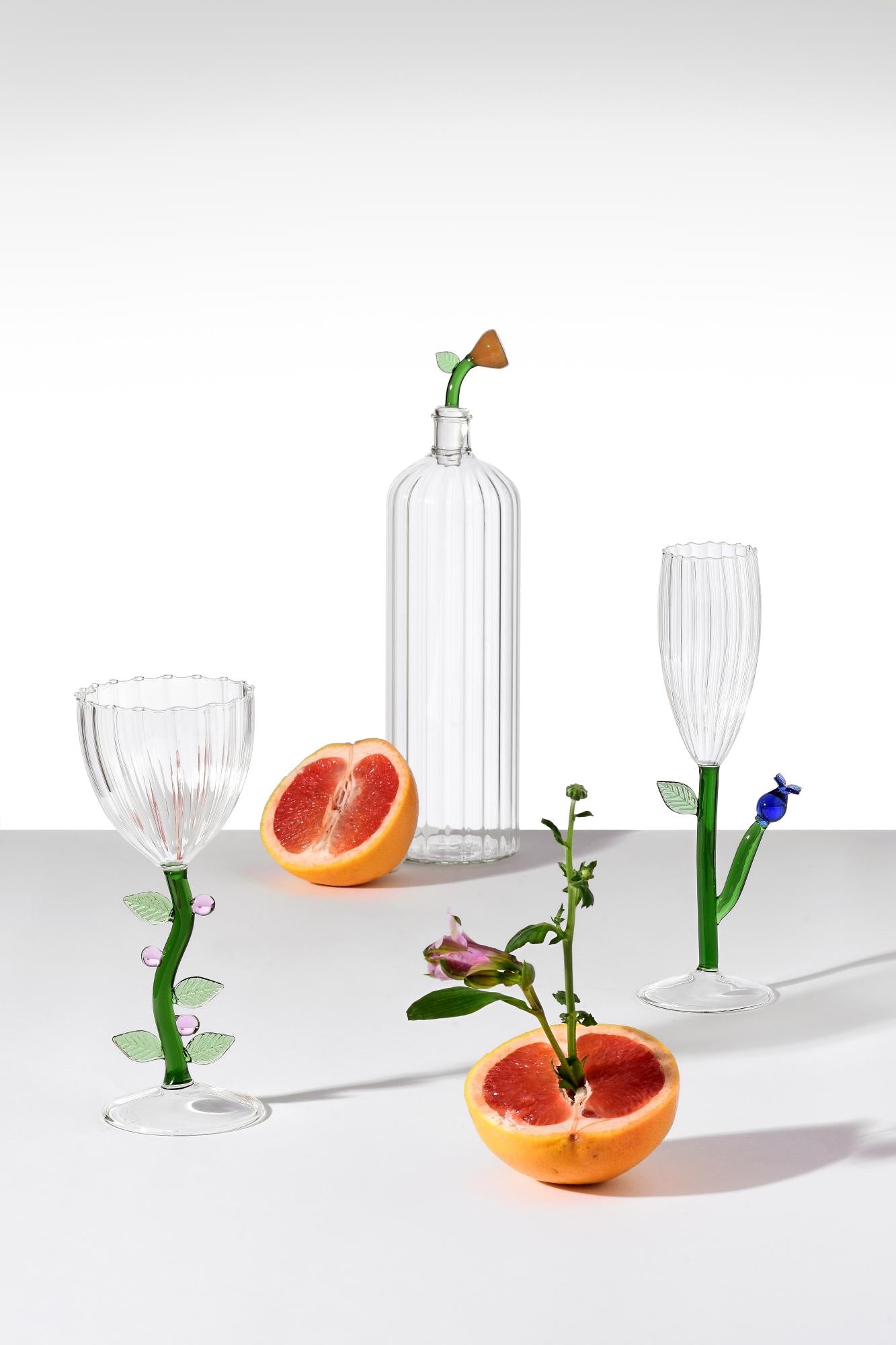 Ichendorf Milanon samppanjalasi, jonka varressa kukkii sinisiä lasikukkia. Alessandra Baldereschin suunnittelema Botanica-sarja yhdistää italialaisen muotoilun ja luonnon inspiroimat yksityiskohdat. Lasi on valmistettu käsityönä borosilikaattilasista, ja sen keveys sekä kirkkaus tekevät siitä kauniin osan juhlapöytää.