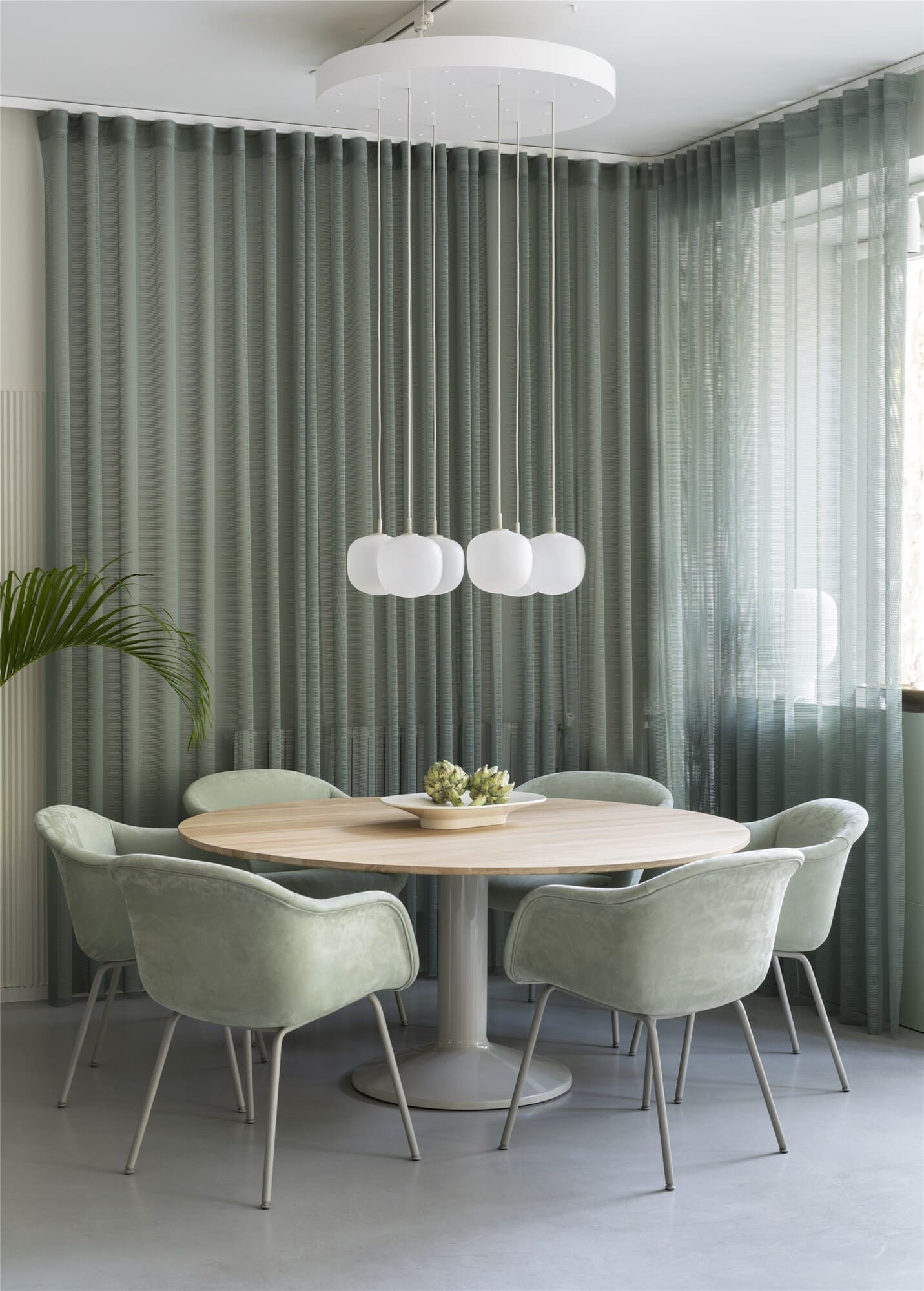 TAF Studion suunnittelema Muuton Rime-valaisin tuo tilaan rauhallisen ja selkeän ilmeen. Muotoilun lähtökohtana on ollut tammenterho, jonka pyöristetty siluetti toistuu valaisimen opaalimaisessa lasikuvussa. Hiekkapuhallettu lasi suodattaa valon pehmeäksi, ja jauhemaalattu yläosa jatkuu yhtenäisenä ripustusjohtoon. Lopputuloksena on tasapainoinen kokonaisuus, joka sulautuu ympäristöönsä.