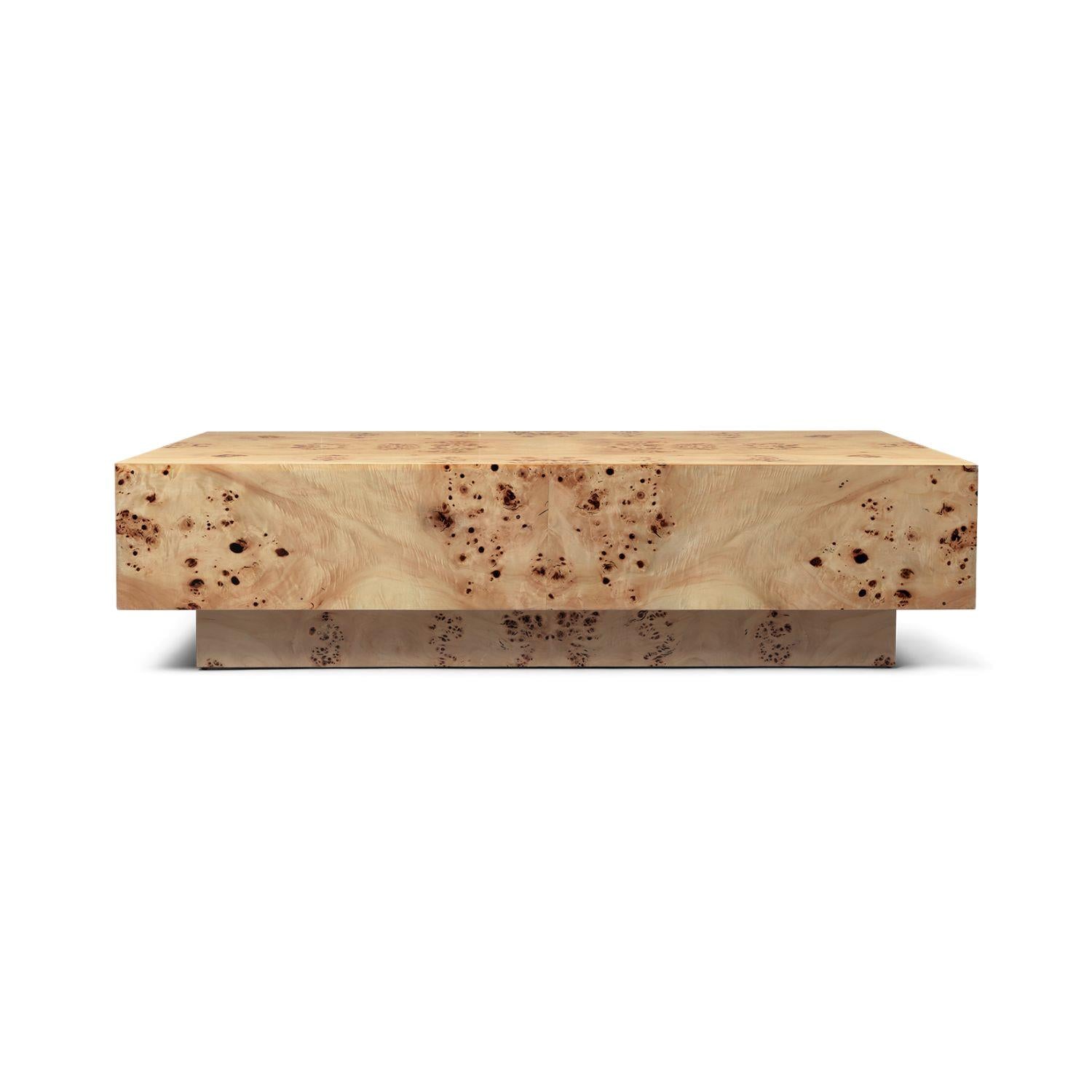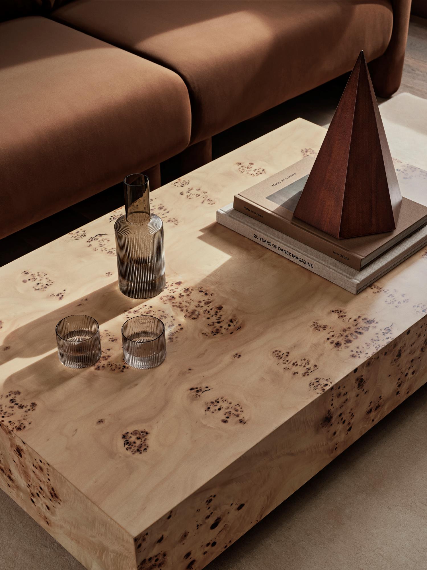 Burl-sohvapöydän viehätys syntyy sen pinnasta. Luonnonvärinen poppelin juuripuuviilu tekee jokaisesta pöydästä yksilöllisen: kuvio on aina hieman erilainen, ja valon osuessa pintaan puun pyörteet ja sävyt tulevat kauniisti esiin. Muoto itsessään on yksinkertainen ja rauhallinen – neliö, puhtaat linjat ja matala profiili.