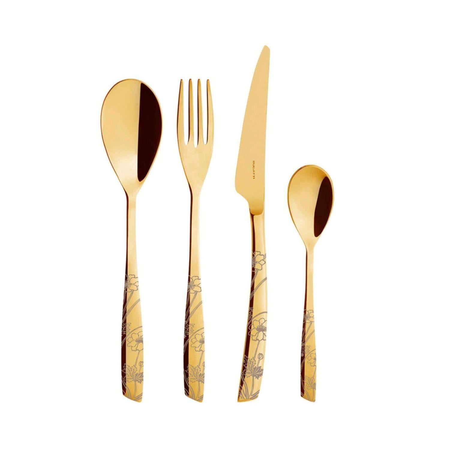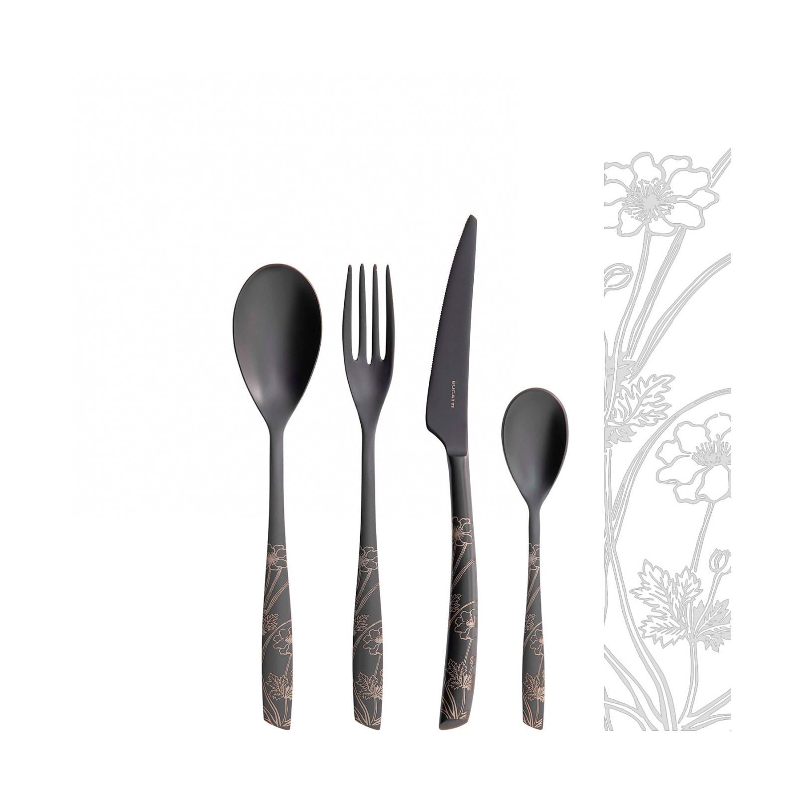 4 kpl setti sisältää 1 kpl haarukka, 1 kpl veitsi, 1 kpl ruokalusikka, 1 kpl pikkulusikka.