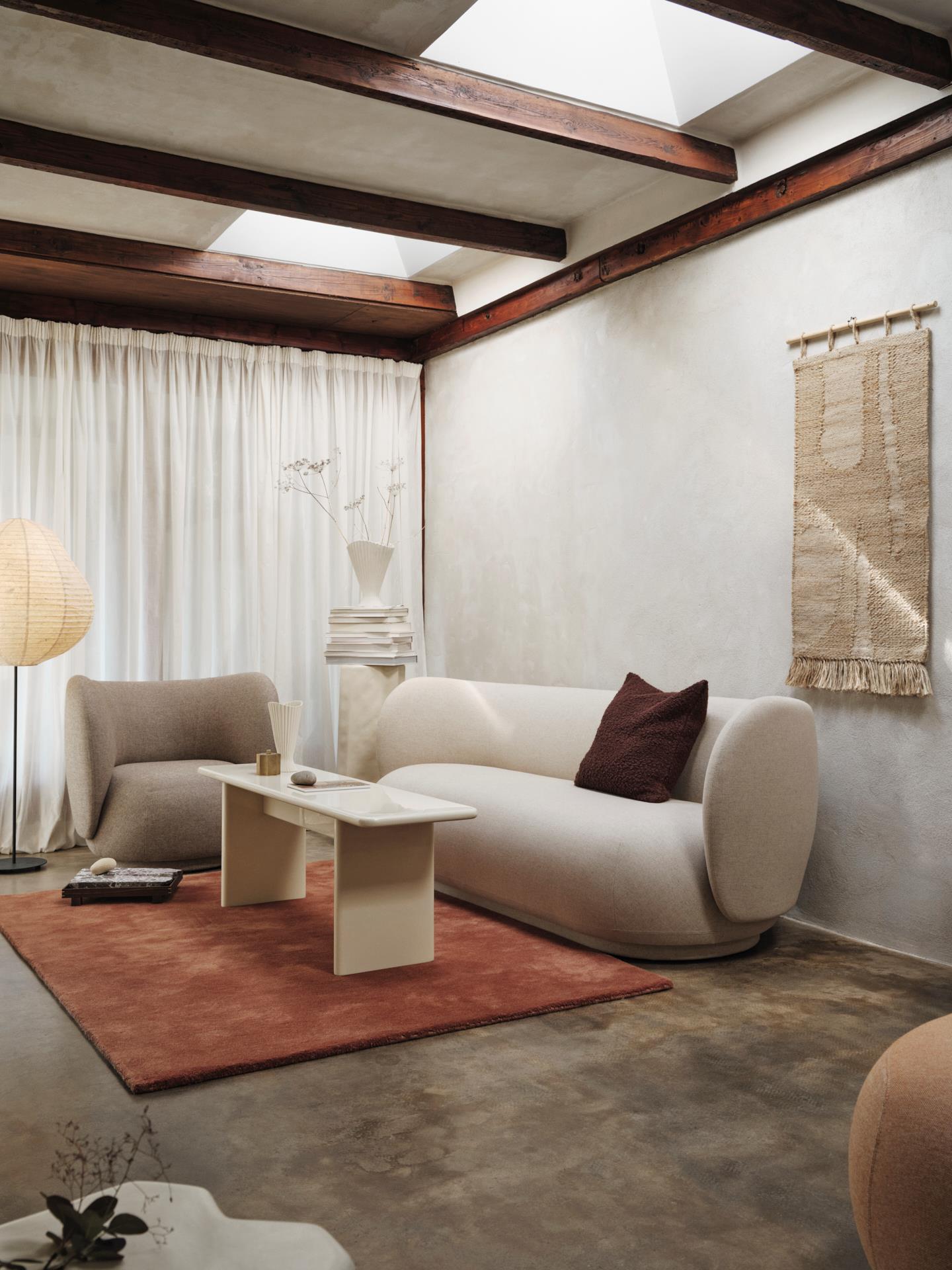 Rico-sohva on muodoltaan pehmeä ja kaareva, ja sen ilme perustuu enemmän mukavuuteen kuin teräviin linjoihin. Kolmen istuttava versio tarjoaa tilavan ja rennon istuinalueen, mutta pysyy silti kevyen näköisenä pyöristettyjen muotojensa ansiosta. Sohvan profiili on matala ja yhtenäinen, mikä tekee siitä helpon sijoittaa niin avariin kuin pienempiinkin tiloihin.